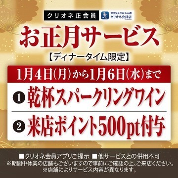 12月28日 14:56 1月4日(月)~6日(水)★乾杯スパークリングワイン&来店ポイント500pt付与! ※ディナータイムのみ、クリオネ会員アプリご提示、他サービス… https://t.co/Q9RUAv66W7